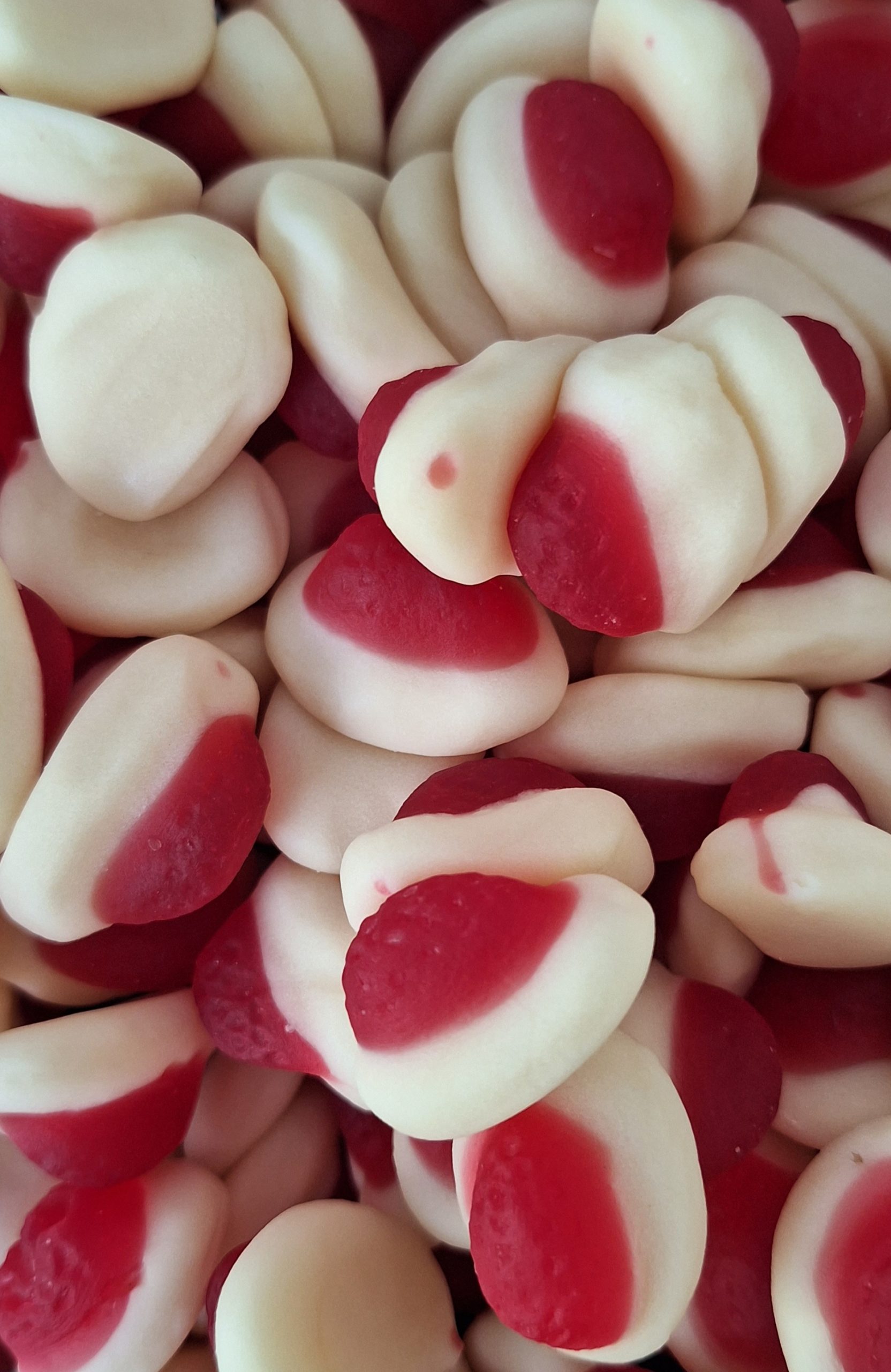 A soft strawberry flavoured jelly sweet sitting on top of a foamy creamy base.